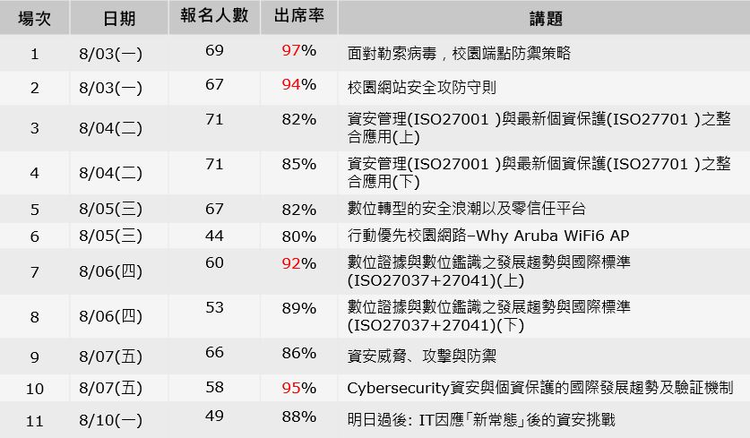 109年舉辦11場區網研討會。11場研討會報名大多超過限制名額,實際出席率約86%,與去年88%相比略低一點點。